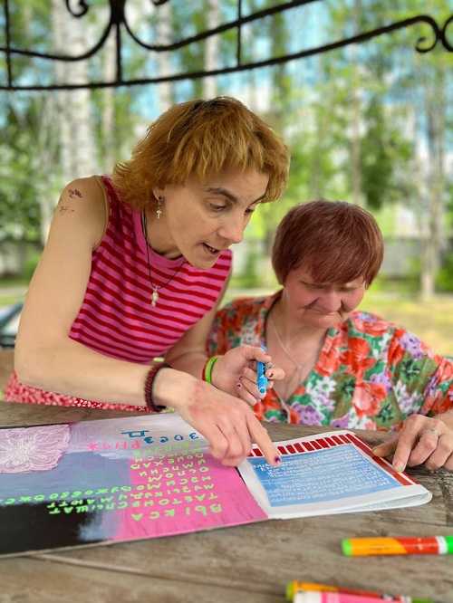 В июне в нашем интернате провела мастер-класс легендарная ZOIKA. Она живет в питерском интернате и создает свои произведения из текста, который находит вокруг. Наши ребята с удовольствием поучились такой манере: оказывается, текст может быть просто узором, картиной безо всякого содержания.